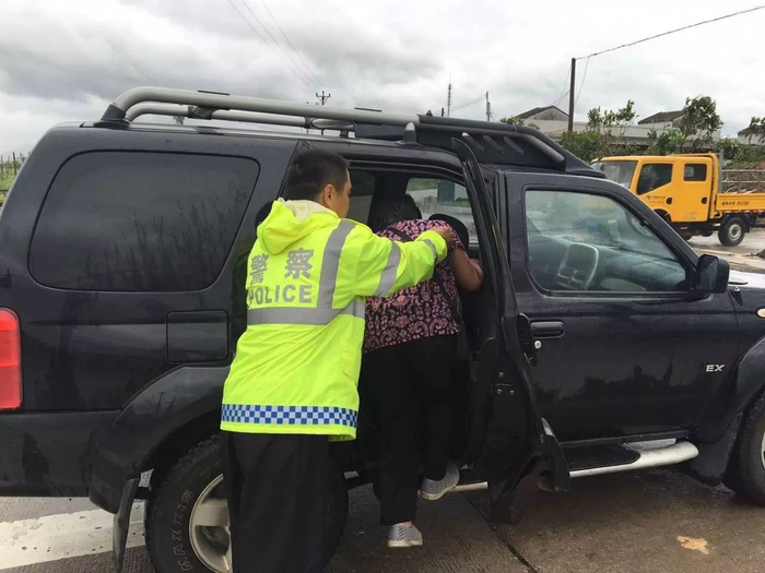 阿婆赶集回家途中遇台风 交警开车送其平安回家