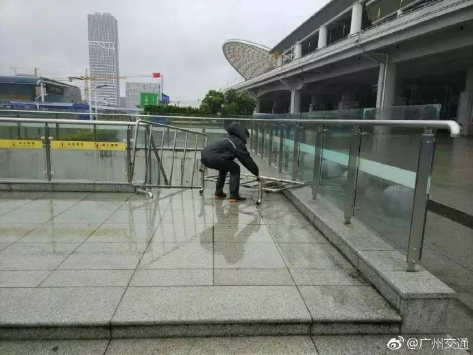 由于受台风天气影响,广州南站公交站场现场南沙64、番99、番100、番110、番52已经停运,现场当班人员利用大声公话筒指引乘客换乘其他交通工具离开,现场客流及营运秩序情况正常。