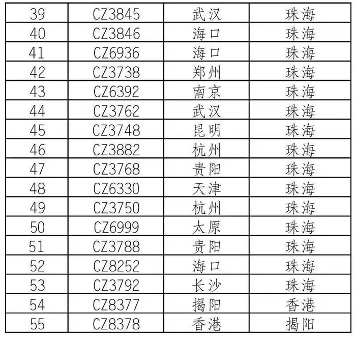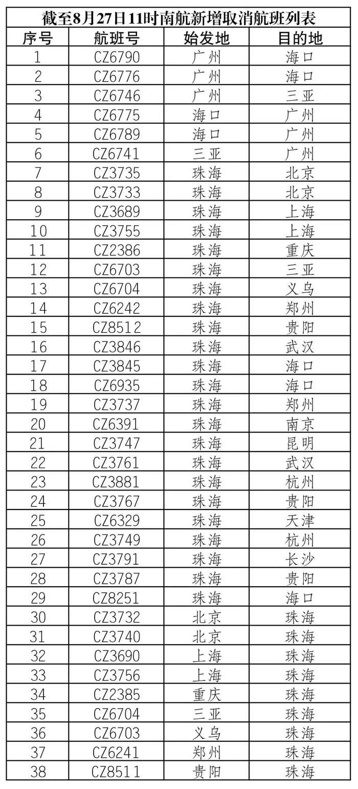 截至27日11:00,南航在珠三角地区新增取消航班55班,其中广州6班、珠海47班、汕头2班。