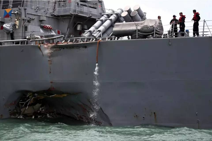 本周一,美国海军“麦凯恩”号导弹驱逐舰在马六甲海峡与一艘油轮相撞,造成驱逐舰上5名水兵受伤,10名水兵失踪。“麦凯恩”舰左舷中后部水线位置被撞出一个大洞,而失踪的10名水兵经过多日搜救,目前最新的消息也只找到了2名水兵的遗体。