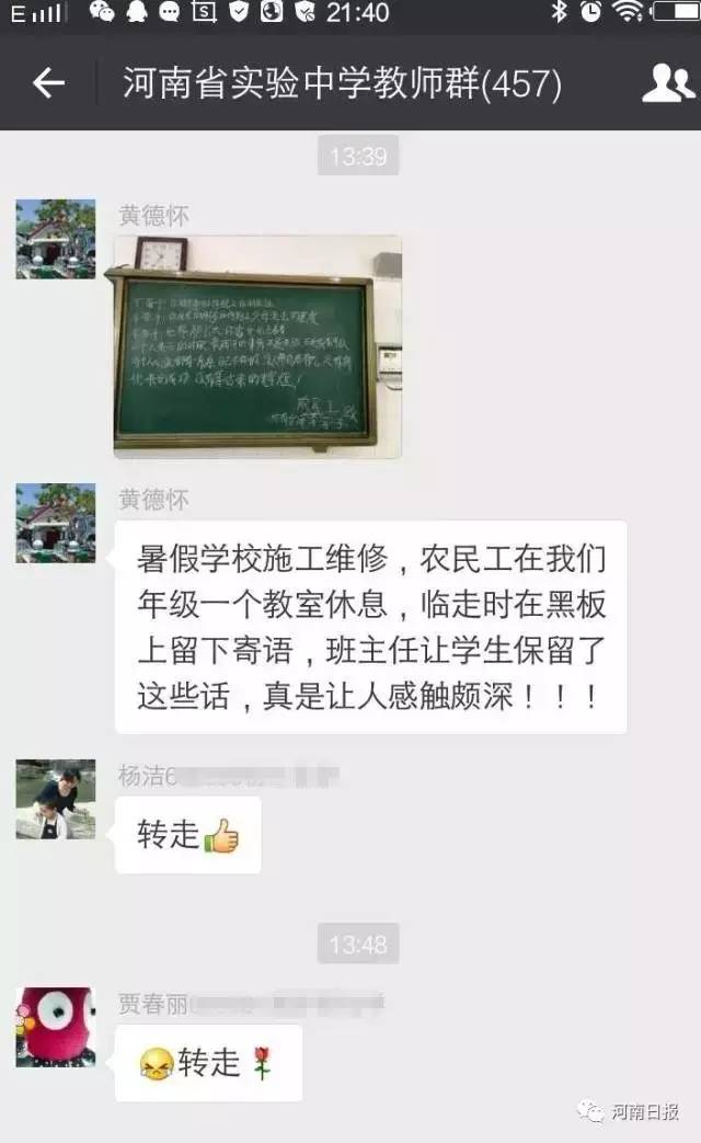 年级长黄德怀老师将黑板寄语的照片发到教师微信群中,立即引发各位老师的共鸣。“感触颇深!”转发、点赞、分享朋友圈。很快,那块儿省实验中学的黑板和农民工刘远华的留言,一起成为风靡微博、微信的网红。