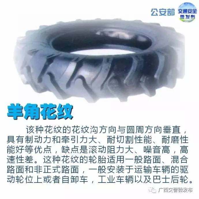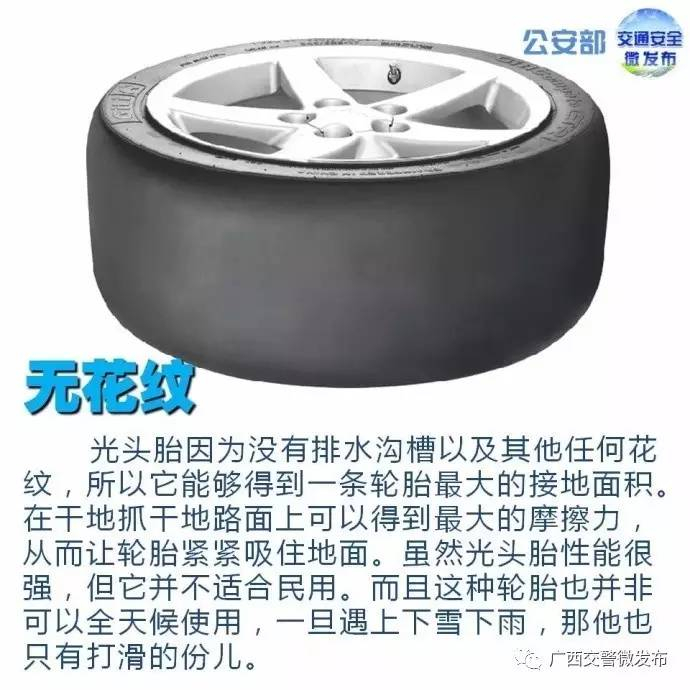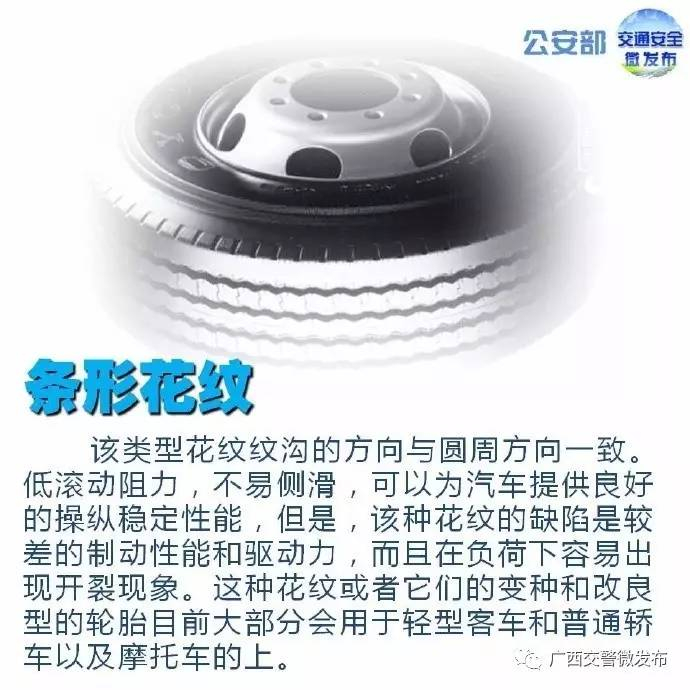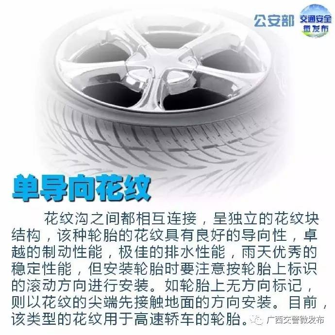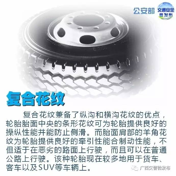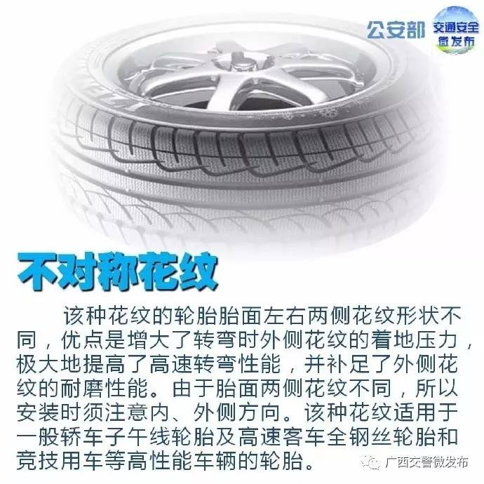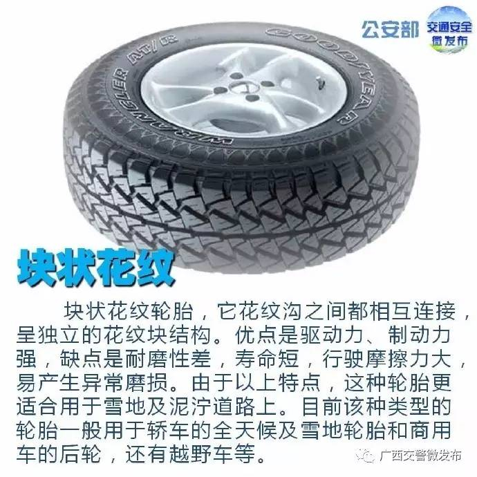 汽车轮胎花纹的学问竟然这么多!9张图告诉你如何选择合适的轮胎! 政府网站 2017.08.2719:40 关注 汽车依靠轮胎支承在路面上,而直接与路面接触的却是轮胎花纹。轮胎不仅承载、滚动,而且通过其花纹块与路面产生的磨擦力,成为汽车驱动、制动和转向的动力之源。 本期小编给科普市面上的各种花纹的轮胎。【本文来自微信公众号“广西交警微发布”】