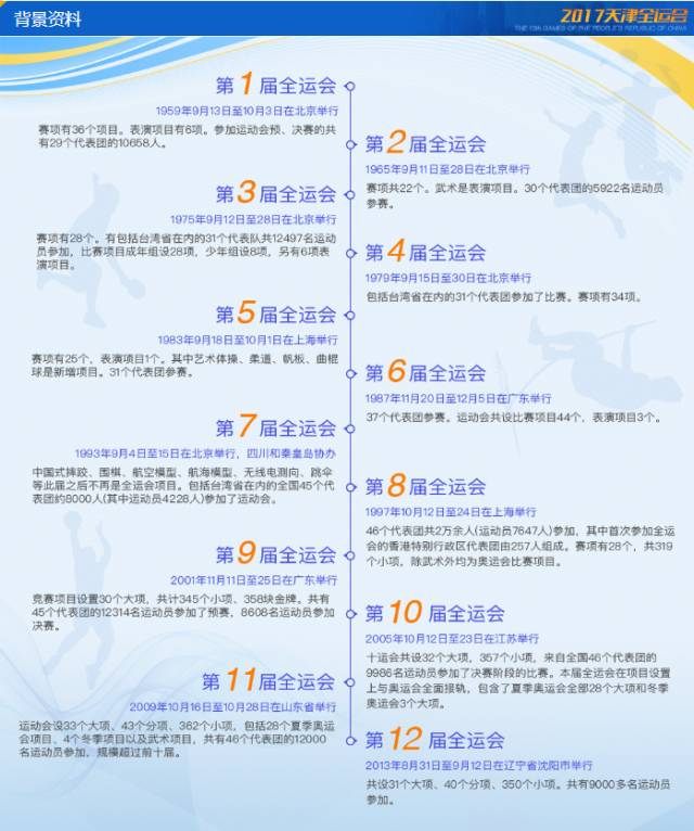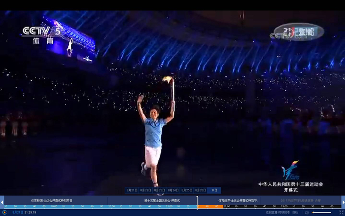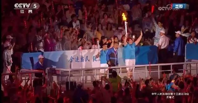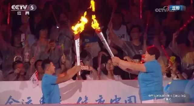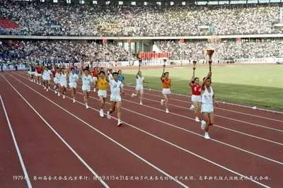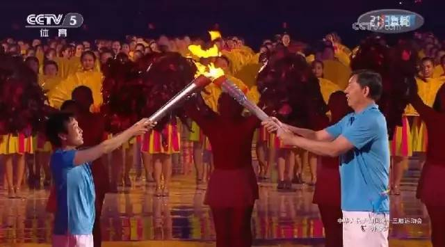 1959年9月13日至10月3日,第一届全运会在北京举办。从第四届全运会开始,火炬传递被加入其中,并开始在开幕式中上演主火炬点燃仪式。第四届:31名运动员跑入点火