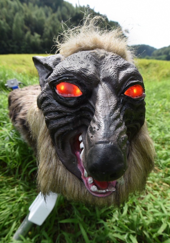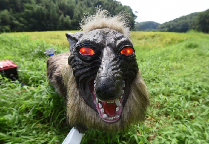 8月25日,在日本木更津,狼型机器人“超极怪兽狼”站在稻田边,威慑可能危害庄稼的野生动物。当野生动物接近庄稼地,装有红外感应器的机器人“超极怪兽狼”会闪烁红色LED“眼睛”,并发出48种包括人声和狼嚎在内的声音,以驱赶动物并保护农作物。新华社/法新