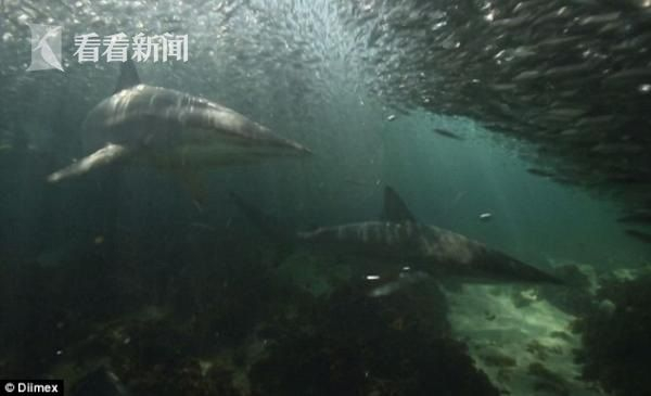 而在鱼群周围,大约200多条鲨鱼“气势汹汹”地扑来。它们冲进鱼群,恣意享受这顿饕餮大餐。鱼群还引来无数只海鸟,它们与鲨鱼一起,享受这顿唾手可得的美餐。
