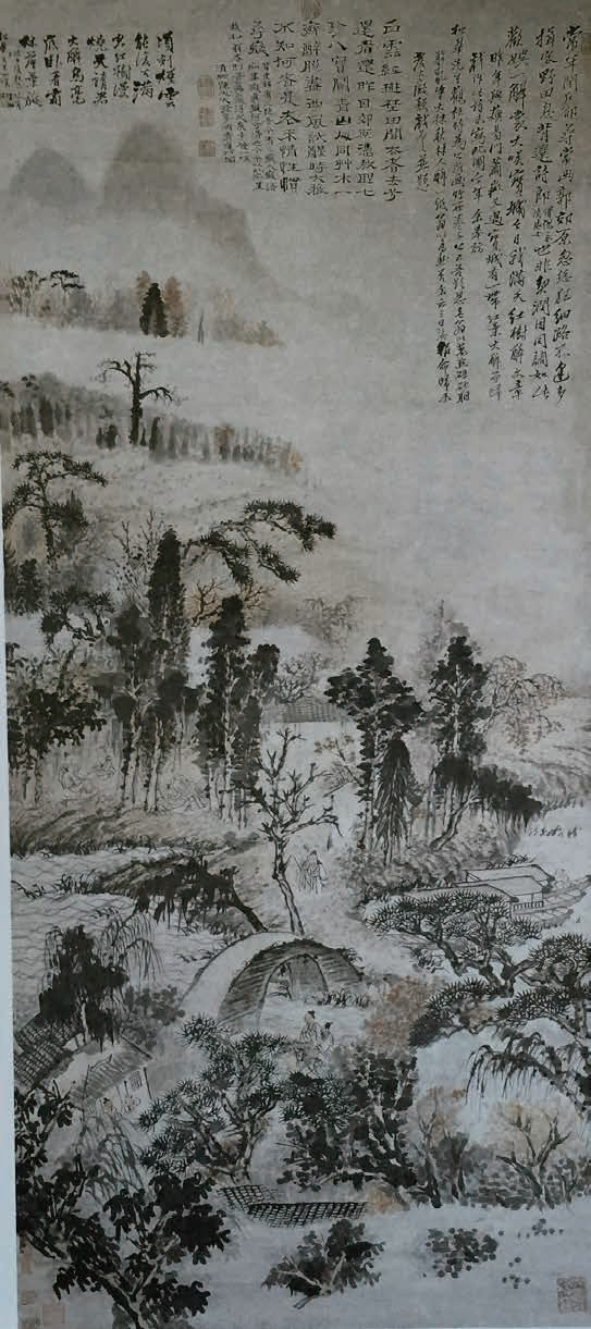 程仕,字松皋,号梅斋,江南桐城人,以荫补内阁中书。《渔洋文略》卷十三《北征日记》载康熙二十七年(1688)二月十九日,舍人程松皋邀饭,有钱澄之等在座。松皋有《梅斋诗集》三卷,《续修四库全书》著录;又有《落叶唱和诗》,主要是与同县陈焯、潘江唱和之作。工诗,晚年居扬州。卓子任《近青堂集》中有《查德尹表兄招同戴南枝、王紫铨、孙物皆、闵宾连、费此度、李简子、李苍存、程松皋、乔东湖、张星闲诸公大集平山堂......》,说明程松皋是活动于扬州的一位文人。《秋林人醉图》的画跋反映出石涛与松皋有很深的交谊。这里石涛提到的《竹西卷子》,原是为程松皋所画,应是石涛生平重要作品,今不见。汪研山《扬州画苑录》引钱塘吴锡璜云:“石涛有《竹西鼓吹画卷》,尝于程鱼门斋头见之。”程鱼门,即程晋芳,父程梦星,即是说《竹西鼓吹画卷》原为程梦星的筱园所收藏。石涛说《竹西卷子》,吴锡璜说《竹西鼓吹画卷》,所说应为一图。杜牧有“谁知竹西路,歌吹是扬州”之句,所以后人又将扬州称为竹西。“竹西鼓吹”这样的诗歌形式为当时扬州文人所喜爱。石涛这幅竹西之图,从吴锡璜所言《竹西鼓吹画卷》看,是一长卷,上应有跋诗,因为“鼓吹”意思就是歌咏。石涛有《广陵竹枝词》十余首,经其弟子石乾录出。其中有:“茱萸湾里打西风,水上行人问故宫。秋草茫茫满天雁,盐烟新涨海陵东。邗沟呜咽走金堤,禅智松风接竹西。城里歌声如沸鼎,月鸣桥上有乌啼。......垂杨一曲午逍遥,城郭依稀在碧霄。蝶板莺簧勾不住,许多儿女问红桥。”石涛的《竹西鼓吹词》,当就是《广陵竹枝词》。