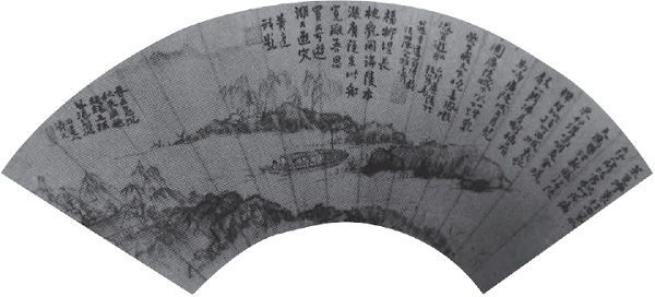 苏州博物馆藏有一扇面,图乃是石涛所画的淡墨山水。上有三跋,第一跋乃石涛自题,题有一诗:“茱萸湾里打西风,水上行人问故宫。秋草茫茫满天雁,盐烟新涨海陵东。邗沟呜咽走金堤,禅智松风接竹西。城里歌声如沸鼎,月明桥上有乌啼。广陵城上月儿圆,广陵城下水如烟。乳燕乍飞天乍晓,姜家墩后买游船。”款:“己卯,《广陵竹枝》,写为公逊年道翁博教。清湘陈人大涤子济。”作于1699年。《广陵竹枝词》乃石涛的组诗,现见有十余首,这里所录乃其中三首。图为公逊先生所作,其人不详。