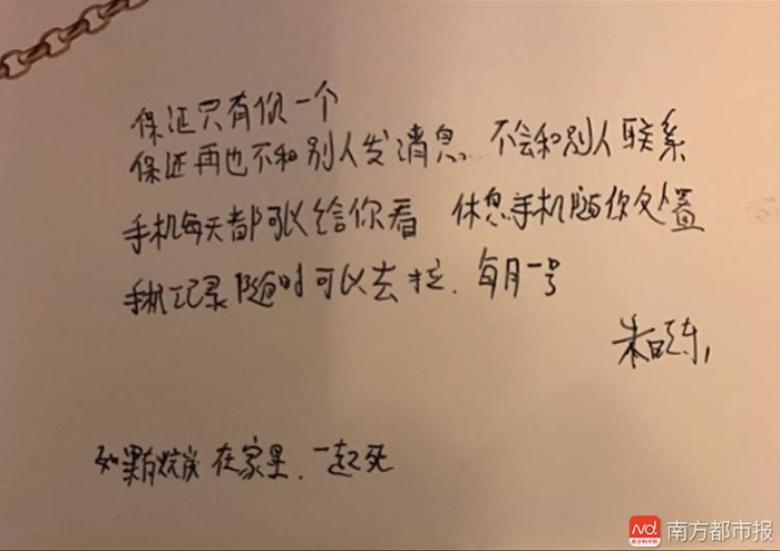 整理杨俪萍的遗物时,家人翻出一张纸条,上面是朱冬潦草的字迹:“保证只有你一个,保证再也不和别人发消息,不会和别人联系,手机每天都可以给你看,手机记录随时可以去拉,每月一号。”左下角还补上一行小字“如果有,烧炭,在家里,一起死。”