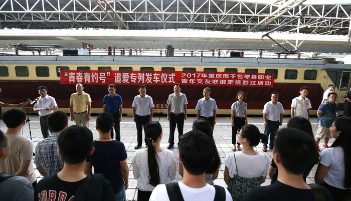 8月26日7:50,全国首趟专为单身青年打造的追爱专列——“青春有约号” 追爱专列载着千名单身青年从重庆火车北站驶向黔江,开启寻爱之旅。
