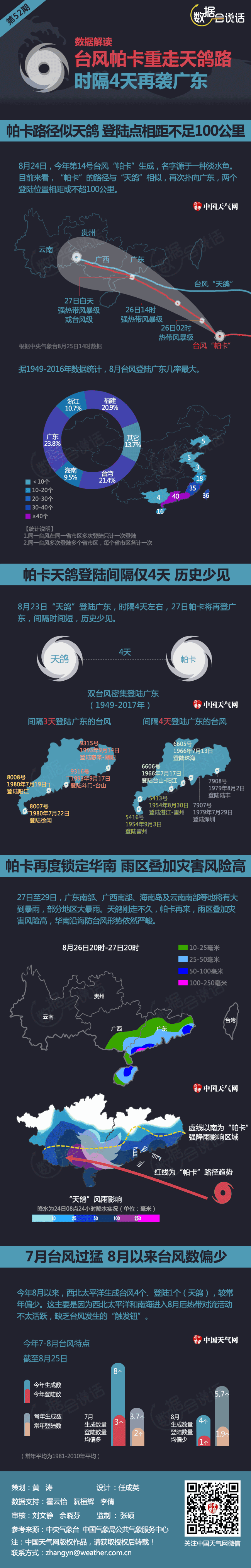 继台风“天鸽”之后,今年第14号台风“帕卡”紧随而来,二者路径相似,“帕卡”亦瞄准广东,登陆间隔仅有4天,两个登陆地点相距不足100公里,刚刚遭受强风雨袭击的华南沿海一带,尤其是广东地区,防台风形势依然严峻,需高度警惕,做好防范。