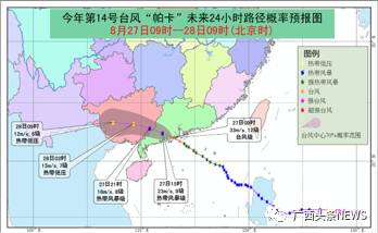 今年第14号台风“帕卡”已于27日9时前后在广东台山市东南部沿海登陆,预计傍晚将进入广西。据降雨数值预报, 8月27~28日广西将出现一次较强降雨天气过程,强降雨区与第13号台风“天鸽”高度重叠。受其影响,桂南大部江河将再次出现1~6米的涨水过程,其中,左江、郁江高水位复涨,将出现今年以来最大洪水,自治区水文水资源局已于8月27日10时启动广西水文测报Ⅳ级应急响应。