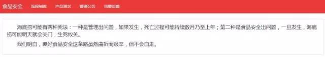 海底捞可能有两种死法:一种是管理出问题,如果发生,死亡过程可能持续数月乃至上年;第二种是食品安全出问题,一旦发生,海底捞可能明天就会关门,生死攸关。