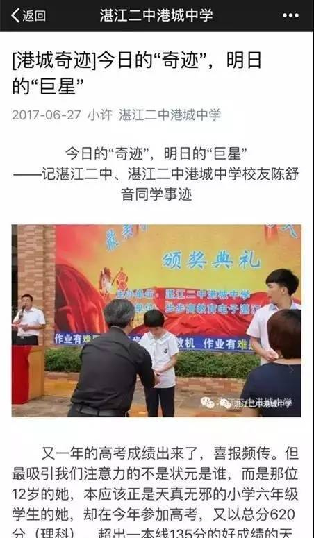 2011年,陈舒音同学以7岁的幼小年龄进入湛江二中港城中学,入学成绩为全级300名。(相关资料显示,湛江二中港城中学是2007年当地市政府指导成立的市直属民办中学,由湛江市二中直接管理。)