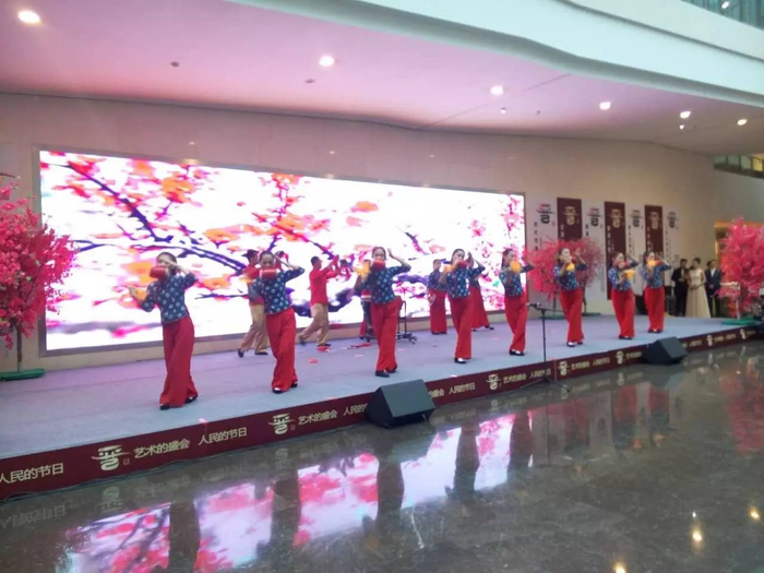 9时45分,中共运城市委副书记、运城市政府代市长朱鹏宣布“首届山西艺术节运城市文化艺术周开幕”。运城文艺工作者精心准备的歌伴舞《这里最早叫中国》、《五谷香自稷山来》、口衔鼓《喜鹊弄梅》、四重唱《厚道运城》、歌伴舞《向往河东》依次上演,特别是梅花奖得主、蒲剧著名演员贾菊兰融入戏曲元素的《河东颂》歌曲,边唱边舞,又加入反手书法、左手书法、双手书法的表演,场内掌声不断,还伴有声声惊叹;观众都被演员们精湛的演技、热情投入的表演所感染,纷纷报以热烈的掌声。