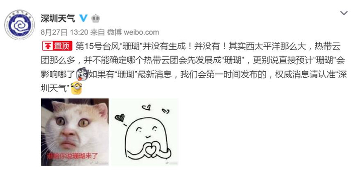 深圳市气象台 27 日发布微博称:第 15 号台风 " 珊瑚 " 并没有生成,其实西太平洋那么大,热带云团那么多,并不能确定哪个热带云团会先发展成 " 珊瑚 ",更别说直接预计 " 珊瑚 " 会影响哪了,如果有 " 珊瑚 " 最新消息,市气象台将会第一时间发布的,权威消息请认准 " 深圳天气 "。