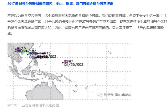 台风 " 帕卡 " 渐远,深圳风雨还未结束,朋友圈又被 " 刷屏 " 了。网络上一篇名为 " 台风‘帕卡’在途中,15 号台风珊瑚即将生成,中山、珠海可能遭 3 连击 ..." 的帖子引发关注。