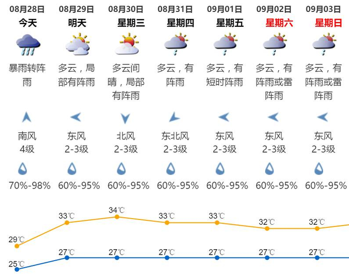 今日天气:暴雨转阵雨;气温25-29℃;南风4级,沿海和高地最大阵风6级左右;相对湿度70%-98%