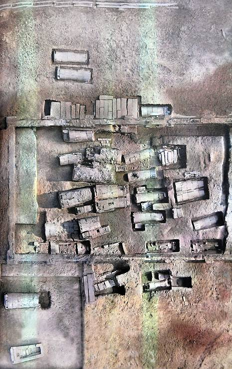 据江西省考古研究院院长徐长青介绍,汤显祖家族墓园共发现明清时期墓葬42座,其中明代墓葬40座,清代墓葬2座,出土了墓志铭6方,另外还发现明清时期的三处附属建筑遗迹。墓葬大致可分为六排,布局基本清晰。6方墓志铭行文、体例基本一致,主要包含人物生平、族谱关系、重要的家族活动以及人物评价等内容,通过研究墓志铭可以明确6座墓主人身份分别为汤显祖高祖汤峻明(汤氏后人称子高公)、汤显祖高祖子高公夫人艾氏、汤显祖祖父汤懋昭(号酉塘,汤氏后人称乔一公)、汤显祖祖母魏夫人、汤显祖原配夫人吴夫人、汤显祖大弟少海公与其夫人潘氏。