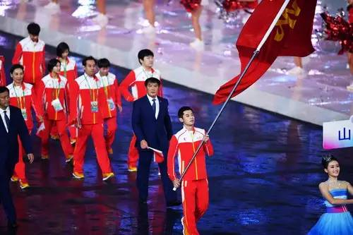 8月27日,第十三届全国运动会开幕式在天津奥林匹克中心体育场举行。这是山东代表团旗手张继科(右二)进入开幕式现场。