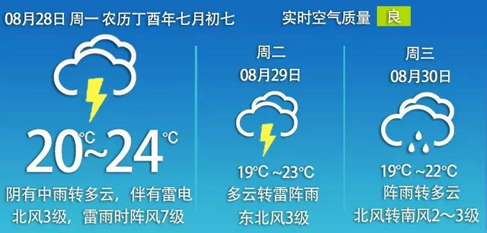 30日阵雨转多云,北风转南风都是2~3级,气温下降。31日~9月1日晴转多云,南风2~3级,气温上升。