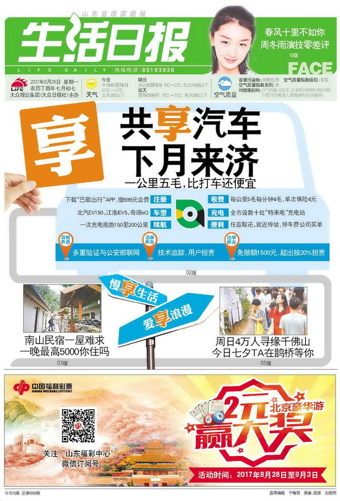 26日,记者从新能源分时租赁企业巴歌出行获悉,该共享汽车品牌预计9月份登陆济南,将在济南、青岛、烟台、临沂、济宁、潍坊6市投入2000多辆纯电动汽车,车型包括北汽EV150、江淮iEV5和奇瑞eQ。该公司相关负责人介绍,他们提供的车辆每公里仅需5毛钱,每分钟4毛钱,每单次需要交纳4元保险费用,交通违章用户需自理,“投入前期还有大量优惠,现在烟台每分钟2毛钱。”