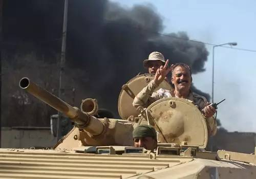 8月26日,在伊拉克泰勒阿费尔镇,一名政府军军官在装甲车上做出胜利手势。泰勒阿费尔镇是极端组织“伊斯兰国”在伊拉克的最后主要据点。伊拉克政府军官员27日说,伊政府军和什叶派民兵武装已经收复了泰勒阿费尔镇北侧的最后两个街区,泰勒阿费尔镇已完全解放。
