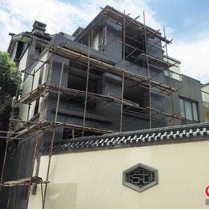 但是,6期7栋108户的脚手架完好,别墅内还有人在施工。这户业主将别墅前后墙统统向外扩张了半米,别墅外墙还打出了“别墅出售”的广告。施工人员说:“前段时间城管来叫停过,但老板喊我们继续搞。”