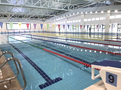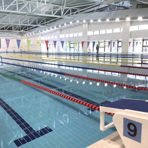 而B馆则是游泳馆,建有游泳训练池5道、VIP泳池6道、老年泳池5道、标准比赛池10道以及一片少儿戏水池。场馆可容纳400名观众,可举办地方性、群众性比赛,可承接省级相关赛事和企事业单位水上运动会。
