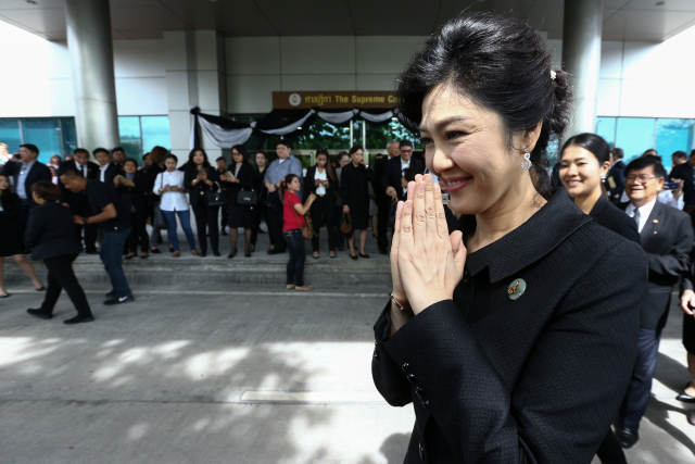 7月21日,在泰国曼谷,泰国前总理英拉(前中)抵达泰国最高法院时向支持者致意。(新华/路透) 【“清白者”逃案】