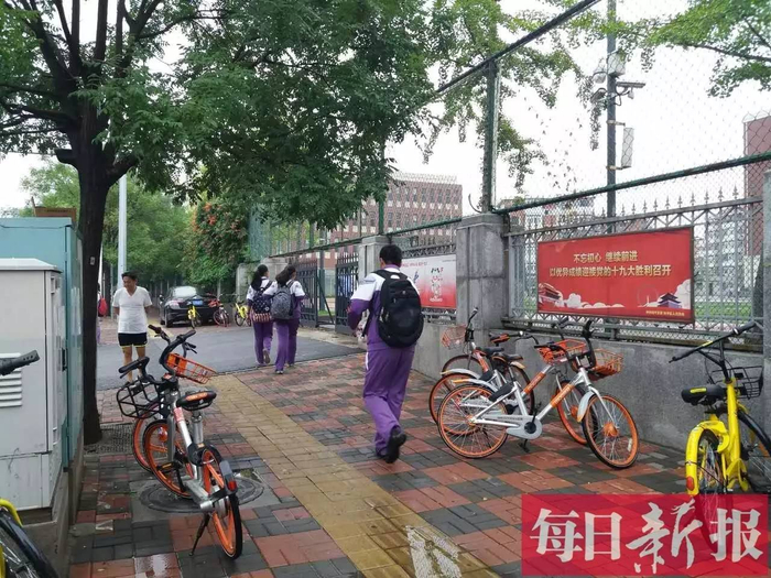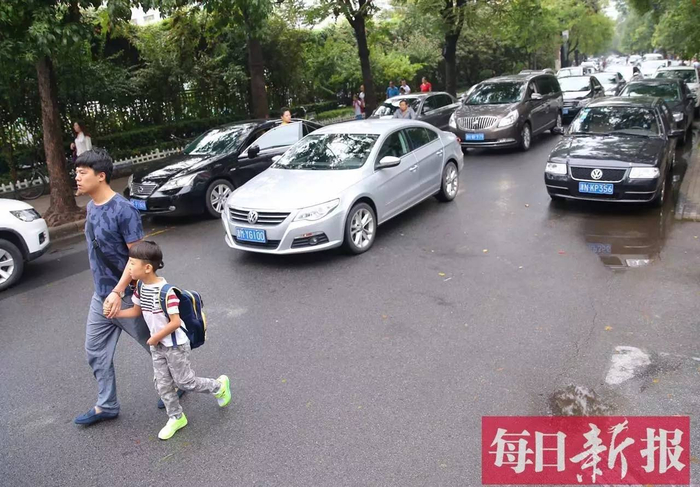 7:10左右,和平区鞍山道上的五十五中学已经敞开大门迎接学生的到来。学生三三两两步入校门,校门口不时有私家车即停即走,还有的家长选择骑自行车送孩子上学。就是如此,校门口也是有些车行缓慢。