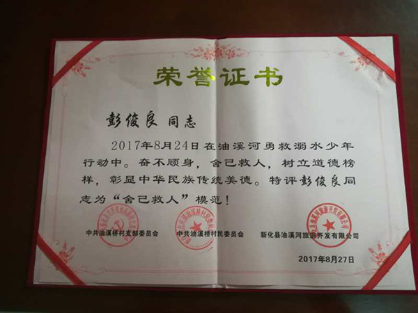 新化县吉庆镇油溪桥村干部彭民辉介绍,8月24日下午,天气炎热,刘某等3名少年私自前往油溪河游泳,游泳中,刘某腿部抽筋、体力不支,不慎溺水,同去的两名同伴施救未果后,求助当地村民。探亲在家的彭俊良此时正与同伴相约去附近打篮球,听到呼救后,他飞奔过去,脱掉球衣立即跳入近6米深的河中搜寻。在彭俊良的带领下,一同赶来的几位年轻人和村干部,也加入河中搜救。