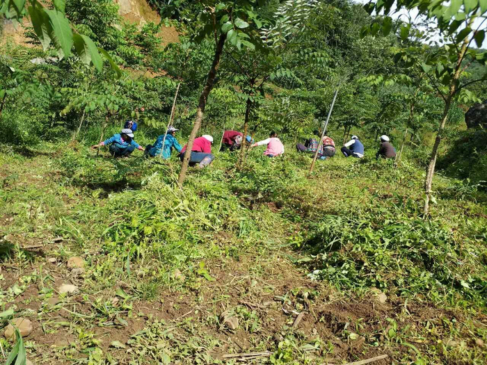 今年来,由于雨水丰富,王朝万所种植的6000多棵刺老包幼苗几乎全部成活,长势也很喜人。因杂草太多,王朝万还请来同村10几个村民帮忙除草。
