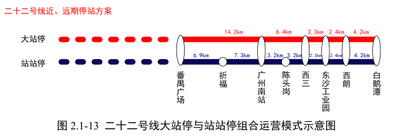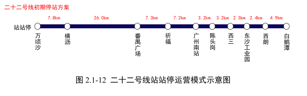 二十二号线起于番禺区番禺广场,经祈福新村、广州南站商务区、西朗,止于荔湾区白鹅潭枢纽,线路全长约31.0km,全部采用地下敷设方式;