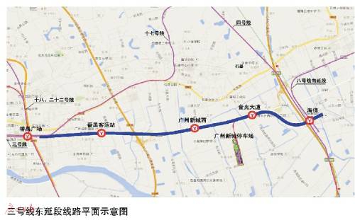 三号线东延段(番禺广场-海傍)全长9.58公里,均为地下线。