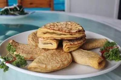 米黄是用黄米磨成细粉后发酵成糊,再用特制的小砂锅烙熟,香气扑鼻,色泽金黄,半月形的外形讨人喜爱;