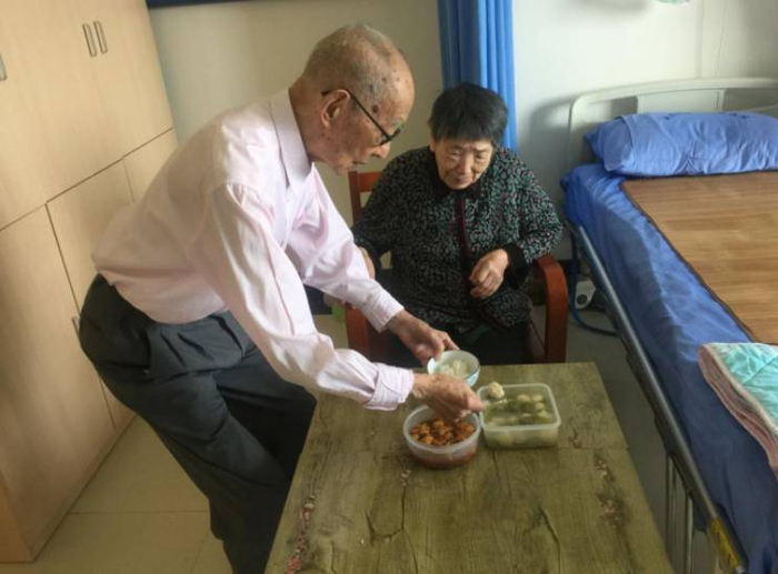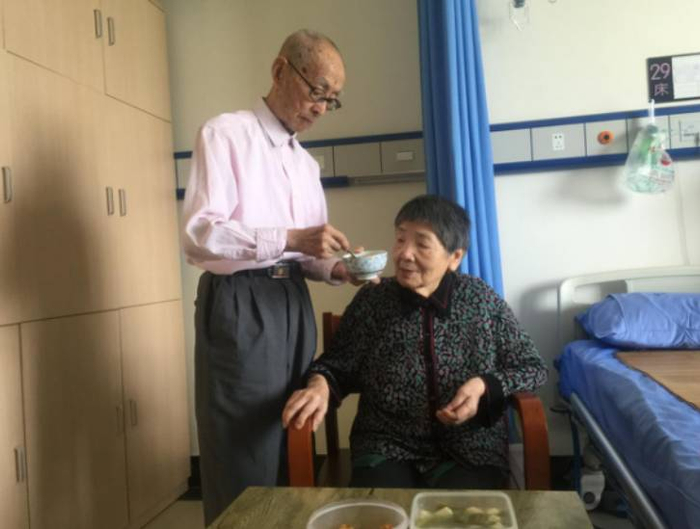 “小心烫,给你吃最爱的圆子肉。”临近中午时分,在医院的病床旁,记者看到了胡爷爷喂王婆婆吃饭的暖心画面。