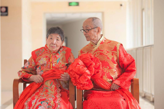 为了见证和纪念爷爷奶奶的美好爱情,七夕节这天,老人的子孙们特意找摄影师,在医院的走廊里给老人们拍摄了一组“婚纱照”。