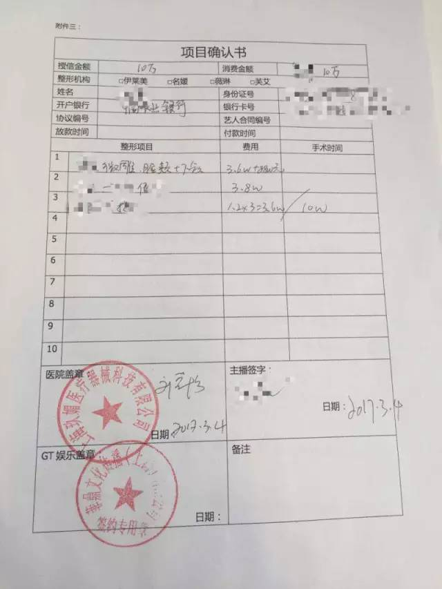 在另一位投诉人的整形项目确认书上,记者看到“娱乐盖章”栏目内有“菲鼎文化传播(上海)有限公司”的签约专用章,而“医院盖章”栏内则清晰敲了“上海玖媚医疗器械科技有限公司”的印章。