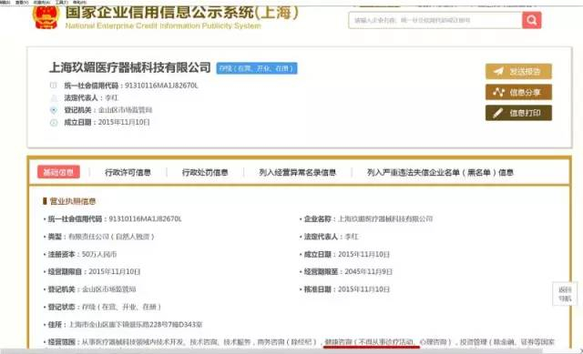 可在上海市卫计委、市卫生监督所官方网站上并没有“上海玖媚医疗器械科技有限公司”任何信息。根据国家企业信用信息公示系统(上海)显示,上海玖媚医疗器械科技有限公司的经营范围被明确:不得从事诊疗活动。