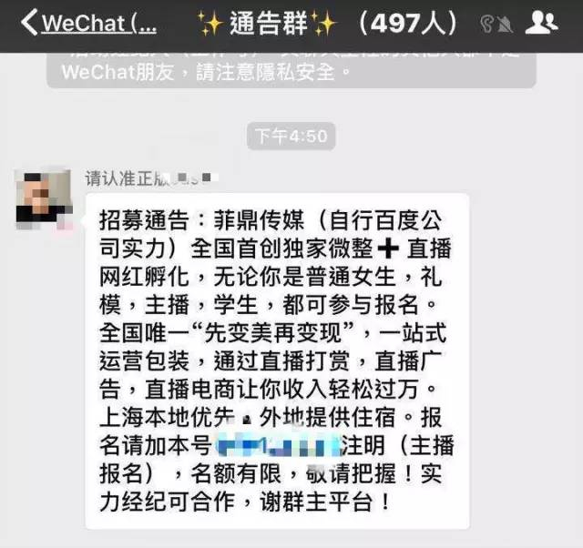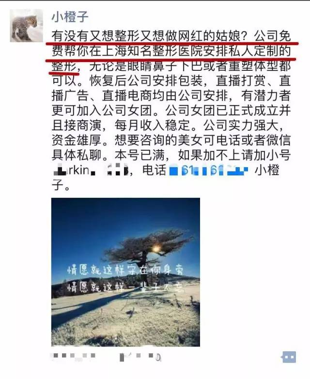 记者在众多投诉材料中还发现一条“星云主播招募令”在微信圈内频频闪现:“有没有又想整形又想做网红的姑娘?公司免费帮你在上海知名整形医院安排私人定制……恢复后公司安排包装,直播打赏、直播广告、直播电商均由公司安排……”;“免费整形、平台推荐、保底底薪、先变美后表现,毫无压力!赶紧联系我吧……”