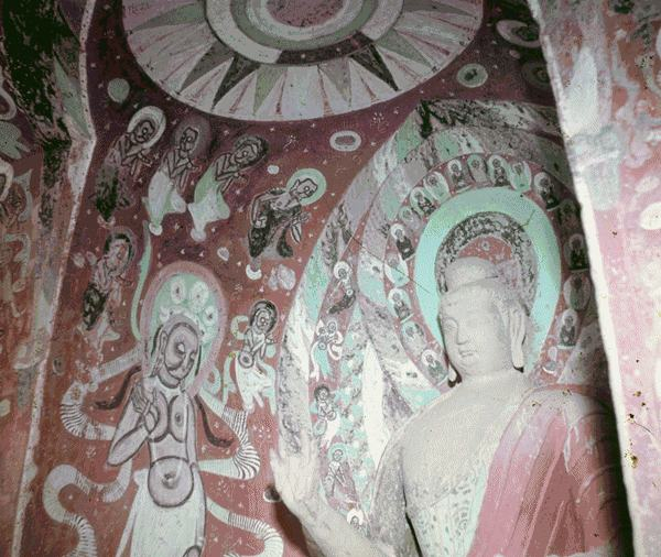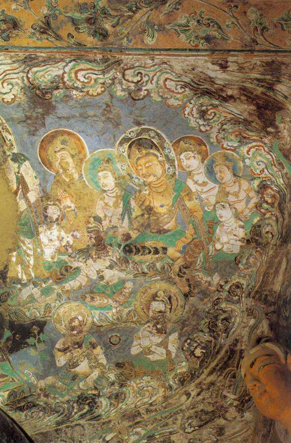↑第254窟壁画,飞天绕佛头起舞