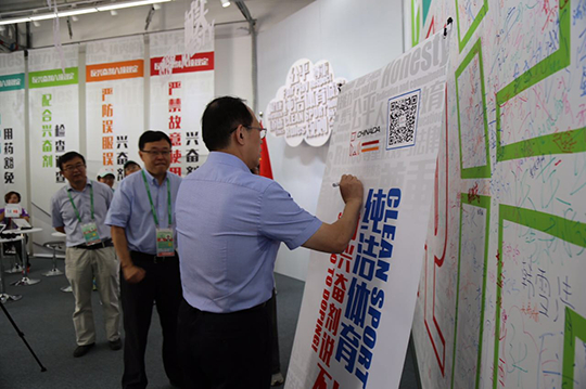 仲文局长之后还视察了反兴奋剂教育拓展基地。陈志宇就本次全运会反兴奋剂教育拓展的工作情况,设计理念以及创新内容进行了介绍。本次反兴奋剂教育拓展以“体育精神”为主题,通过知识答题、视频学习、互动游戏等方式,让参与者在娱乐互动的同时,提高其自觉抵制反兴奋剂的意识和能力。仲文局长亲自体验教育拓展的游戏活动,在“纯洁体育”主题签名墙上签名,并在“体育精神云”下合影留念。