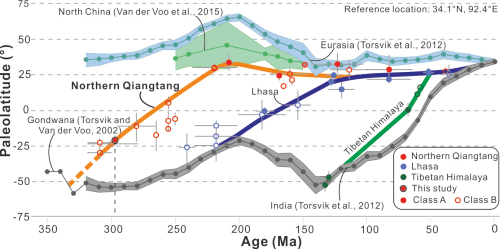 中国科学院青藏高原研究所博士宋培平等人对北羌塘下二叠统开心岭群火山岩进行了详细的年代学和古地磁学研究,获得了基于火山熔岩的高质量古纬度数据。研究表明:(1)北羌塘地块在早二叠世时期(ca. 297 Ma)位于为南半球21.9 ± 4.7°S;(2)综合前人发表的古地磁数据、碎屑锆石物源和古生物证据,指示北羌塘地块在二叠纪之前已经从冈瓦纳大陆裂解出来;(3)自310 Ma到210 Ma,在约100 Ma时间内,北羌塘地块自南向北漂移了约7000 km,平均漂移速度为7.0 cm/yr。