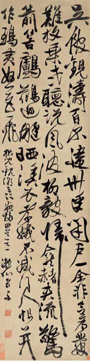 除了绘画之外,徐渭的传世的主要是行草,或以行书为主夹入草书,或以草书为主夹入行书,其书法面孔之奇异,用笔之大胆,实非同代书家所能及。他在绝大多数作品中表现出来的无拘无束,着实让观者无所适从,难以对其师承有一个准确的判断。有人甚至用“绝去依傍”或“无可参照”来形容其书法。