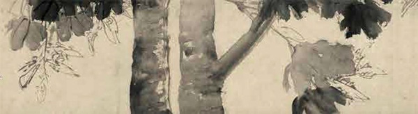 其中梧桐树干圆浑光洁,肥大的叶片在向阳光照下呈现绿色的透明感;藤本的葡萄,枝干显得枯劲带有韧性,叶瓣簇聚覆盖,和梧桐叶的洒脱非常不同。累累的葡萄,虽然随手拈来,却光亮而又错落有致。在它旁边的芭蕉,仅用几笔淡墨线条,把茎秆的肥嫩生态表现无余。顶端用浓墨淡墨,画了向左右舒展的一丛蕉叶。在幅式高不过两尺而有三丈多的纸上,画上梧桐、葡萄、芭蕉三种,已能基本左右全局。而中间添上菊花、南瓜、扁豆、紫薇,又安排它们上下俯昂,笔致紧敛而布局疏松,宾不夺主。