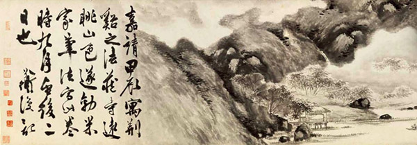 4年之后的,嘉靖甲辰年(1544 年),陈淳生命中最后一个的夏末,他在近五米的长卷上,用米家山水法创作了气势磅礴也是最重要的山水画——《罨画山图》。
