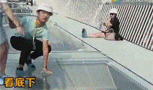 玻璃栈道相当透明,往下可看到悬崖绝壁下的万丈深渊,现场有的游客靠着右侧山体紧张慢步,有人吓得慢慢爬过,还有人吓得打道回府。
