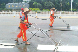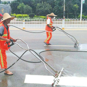 工作人员正在用便携式清洗车清洗路面