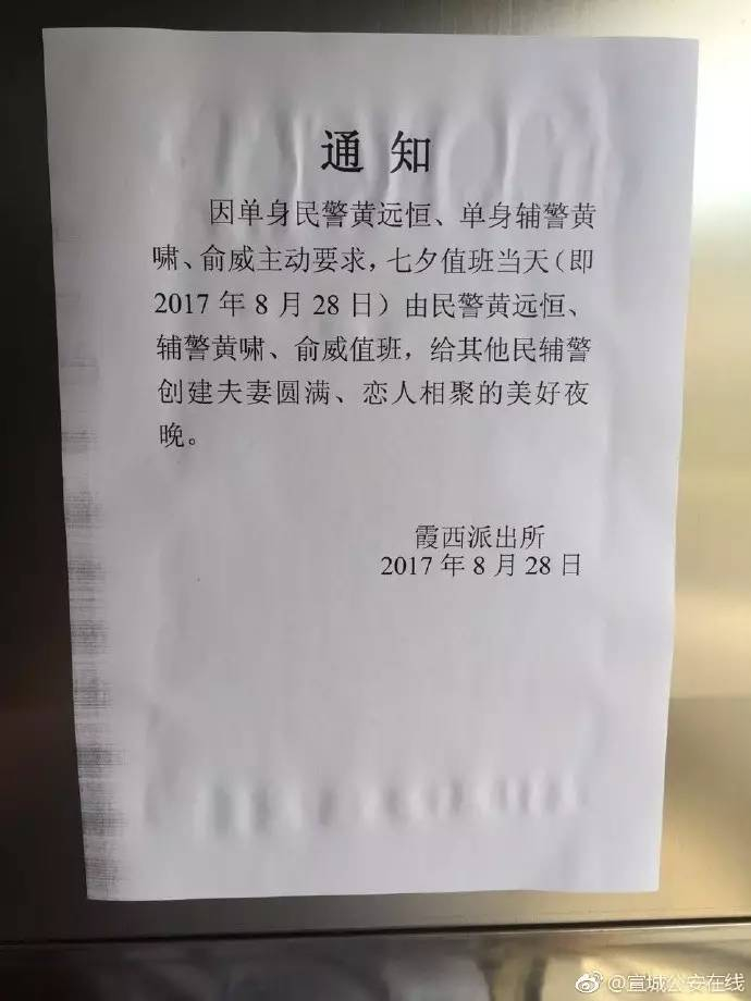 昨日,安徽宣城霞西派出所的几位单身民辅警主动提出代班,好让其他人享受夫妻圆满、恋人团聚的夜晚。