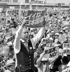 | 今年5月初,数万日本民众在东京举行集会,纪念“和平宪法”颁布70周年,抗议安倍政府的修宪企图。新华社发 |
